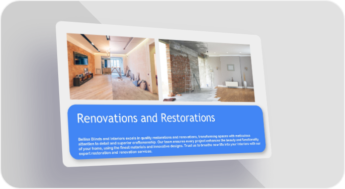 Renovations and Restorations Bellisa Blinds and Interiors excels in quality restorations and renovations, transforming spaces with meticulous attention to detail and superior craftsmanship. Our team ensures every project enhances the beauty and functionality of your home, using the finest materials and innovative designs. Trust us to breathe new life into your interiors with our expert restoration and renovation services.
