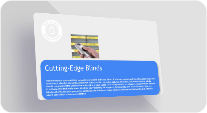 Cutting-Edge Blinds Transform your space with the innovative creations of Bellisa Blinds & Interiors. Achieving the perfect decor requires a harmonious blend of elements, and blinds play a crucial role in this balance. At Bellisa, we understand that blinds should complement the unique characteristics of your space. That's why we offer an extensive range of blinds tailored to suit any style and preference. Whether you’re looking for elegance, functionality, or a touch of modern flair, our blinds will enhance your property's aesthetic and ambiance. Explore the possibilities with Bellisa Blinds & Interiors, where your vision meets our expertise.