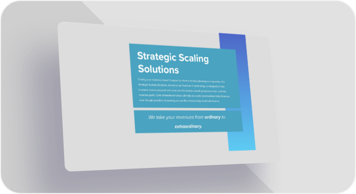 Strategic Scaling Solutions Scaling your business doesn't happen by chance; it takes planning and expertise. Our Strategic Scaling Solutions, driven by our NextGen AI technology, is designed to help business owners pinpoint and overcome the barriers standing between them and their revenue goals. Clark International Group will help you scale your business faster than you ever thought possible, increasing your profits and securing market dominance. We take your revenues from ordinary to extraordinary.