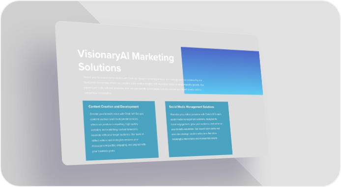 VisionaryAI Marketing Solutions Unlock your business's full potential with Clark Intl Group's marketing analysis and strategy services powered by our NextGenAI technology, where we combine deep market insights with innovative tactics to drive impactful growth. Our expert team crafts tailored strategies that not only identify opportunities but also ensure your brand stands out in a competitive marketplace. Content Creation and Development Social Media Management Solutions Elevate your brand's voice with Clark Int’l Group's Maximize your online presence with Clark Int’l Group's content creation and development services, social media management solutions, designed to where we produce compelling, high-quality boost engagement, grow your audience, and enhance websites and marketing content tailored to your brand's reputation. Our expert team crafts and resonate with your target audience. Our team of executes strategic social media plans that drive skilled writers and strategists ensures your meaningful interactions and measurable results. message is impactful, engaging, and aligned with your business goals.
