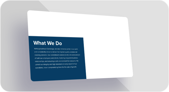 What We Do At Neighborhood Concierge, we take immense pride in our work and consistently strive to deliver the highest quality commercial cleaning services. Our commitment extends to the ethical treatment of both our employees and clients, fostering long-term business relationships, and ensuring a safe environment for everyone. We uphold our integrity and high standards in every aspect of our operations, never compromising them for the sake of growth.
