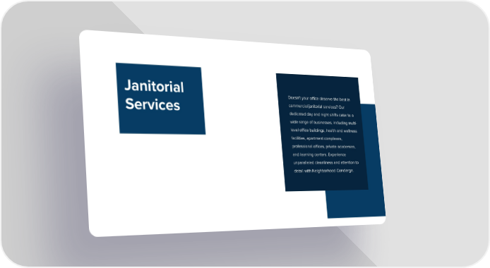 Janitorial Doesn't your office deserve the best in Services commercial janitorial services? Our dedicated day and night shifts cater to a wide range of businesses, including multi- level office buildings, health and wellness facilities, apartment complexes, professional offices, private academies, and learning centers. Experience unparalleled cleanliness and attention to detail with Neighborhood Concierge.
