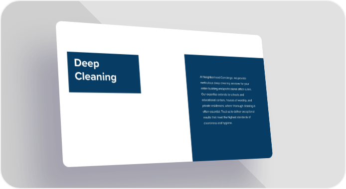 Deep Cleaning At Neighborhood Concierge, we provide meticulous deep cleaning services for your entire building and professional office suites. Our expertise extends to schools and educational centers, houses of worship, and private residences, where thorough cleaning is often essential. Trust us to deliver exceptional results that meet the highest standards of cleanliness and hygiene.