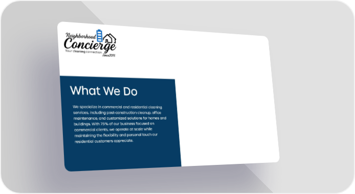 What We Do We specialize in commercial and residential cleaning services, including post-construction cleanup, office maintenance, and customized solutions for homes and buildings. With 75% of our business focused on commercial clients, we operate at scale while maintaining the flexibility and personal touch our residential customers appreciate.