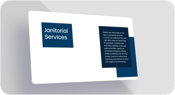 Janitorial Services Doesn't your office deserve the best in commercial janitorial services? Our dedicated day and night shifts cater to a wide range of businesses, including multi- level office buildings, health and wellness facilities, apartment complexes, professional offices, private academies, and learning centers. Experience unparalleled cleanliness and attention to detail with Neighborhood Concierge.