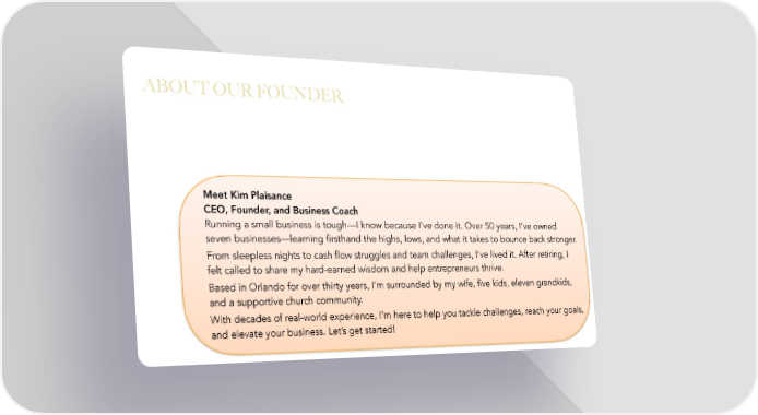 ABOUT OUR FOUNDER Meet Kim Plaisance CEO, Founder, and Business Coach Running a small business is tough—I know because I’ve done it. Over 50 years, I’ve owned seven businesses—learning firsthand the highs, lows, and what it takes to bounce back stronger. From sleepless nights to cash flow struggles and team challenges, I’ve lived it. After retiring, I felt called to share my hard-earned wisdom and help entrepreneurs thrive. Based in Orlando for over thirty years, I’m surrounded by my wife, five kids, eleven grandkids, and a supportive church community. With decades of real-world experience, I’m here to help you tackle challenges, reach your goals, and elevate your business. Let’s get started!