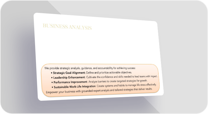 BUSINESS ANALYSIS We provide strategic analysis, guidance, and accountability for achieving success: • Strategic Goal Alignment: Define and prioritize actionable objectives. • Leadership Enhancement: Cultivate the confidence and skills needed to lead teams with impact. • Performance Improvement: Analyze barriers to create targeted strategies for growth. • Sustainable Work-Life Integration: Create systems and habits to manage life stress effectively. Empower your business with grounded expert analysis and tailored strategies that deliver results.