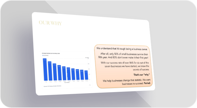 OUR WHY We understand that it’s tough being a business owner. After all, only 50% of small businesses survive their fifth year. And 80% don't even make it their first year! With our success rate of over 86% for six out of the seven businesses we have started, we know the secrets of success. That’s our “why.” We help businesses change that statistic. We want businesses to succeed. Period.